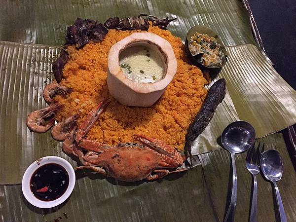 有烤豬肉,蒸螃蟹,烤魚,烤蝦,烤魷魚以及一盅咖哩雞湯~